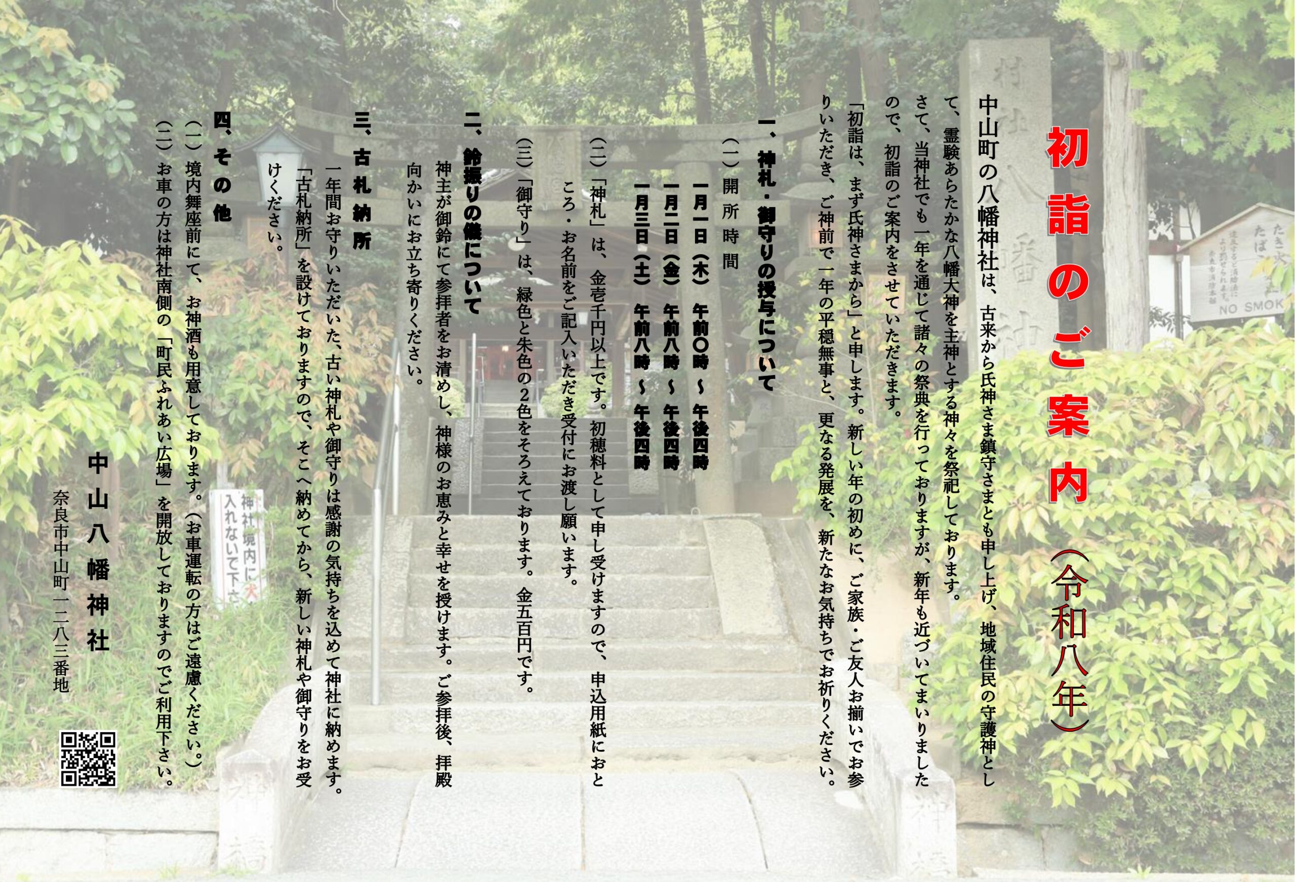 ◆最寄りのバス停奈良交通「平城中山」又は「平城中山北口」バス停より徒歩5分◆お車の方当神社には専用の駐車場は設けておりません。但し、毎月1日と15日、及び祭日には南側の「広場(町民ふれあい広場)」を開放しますのでご利用下さい