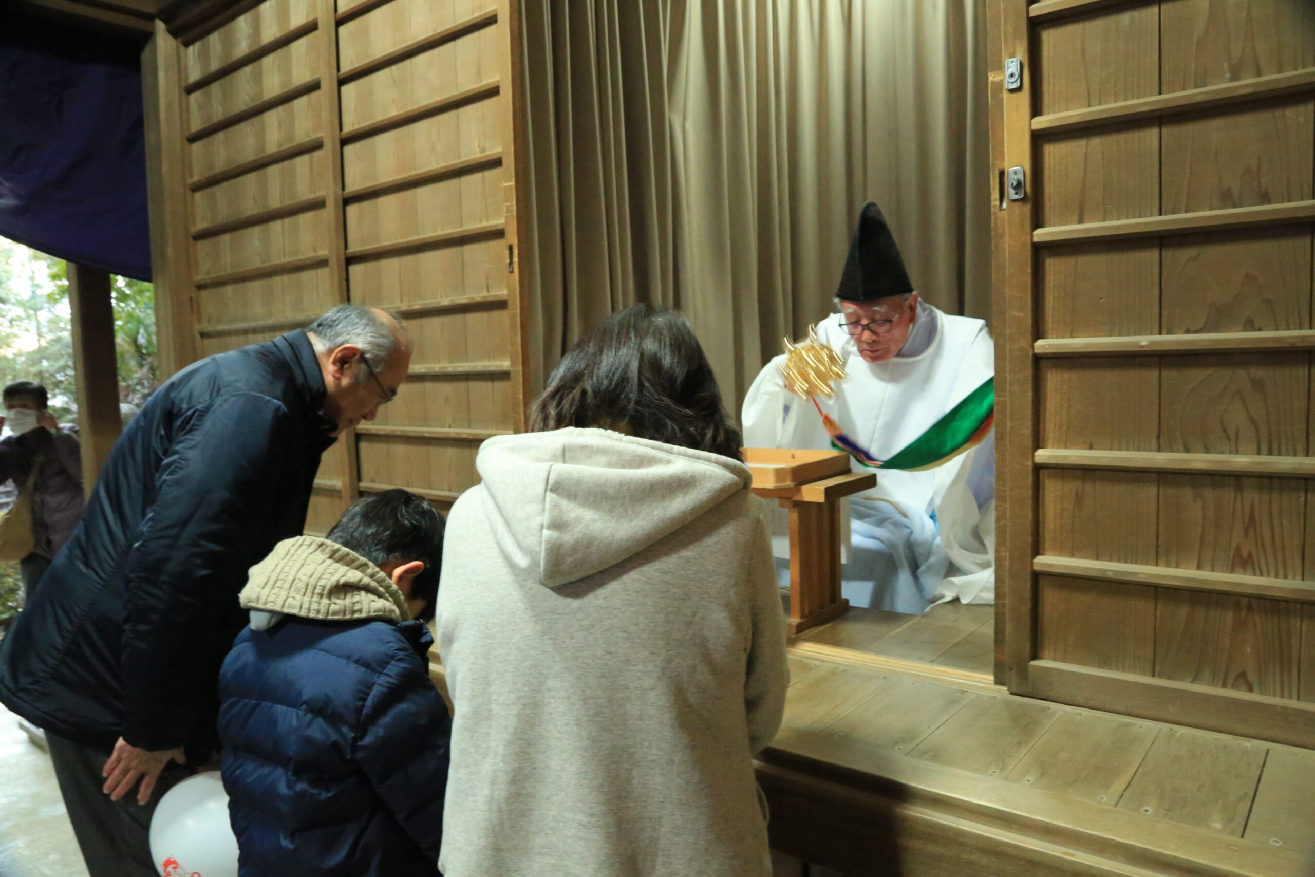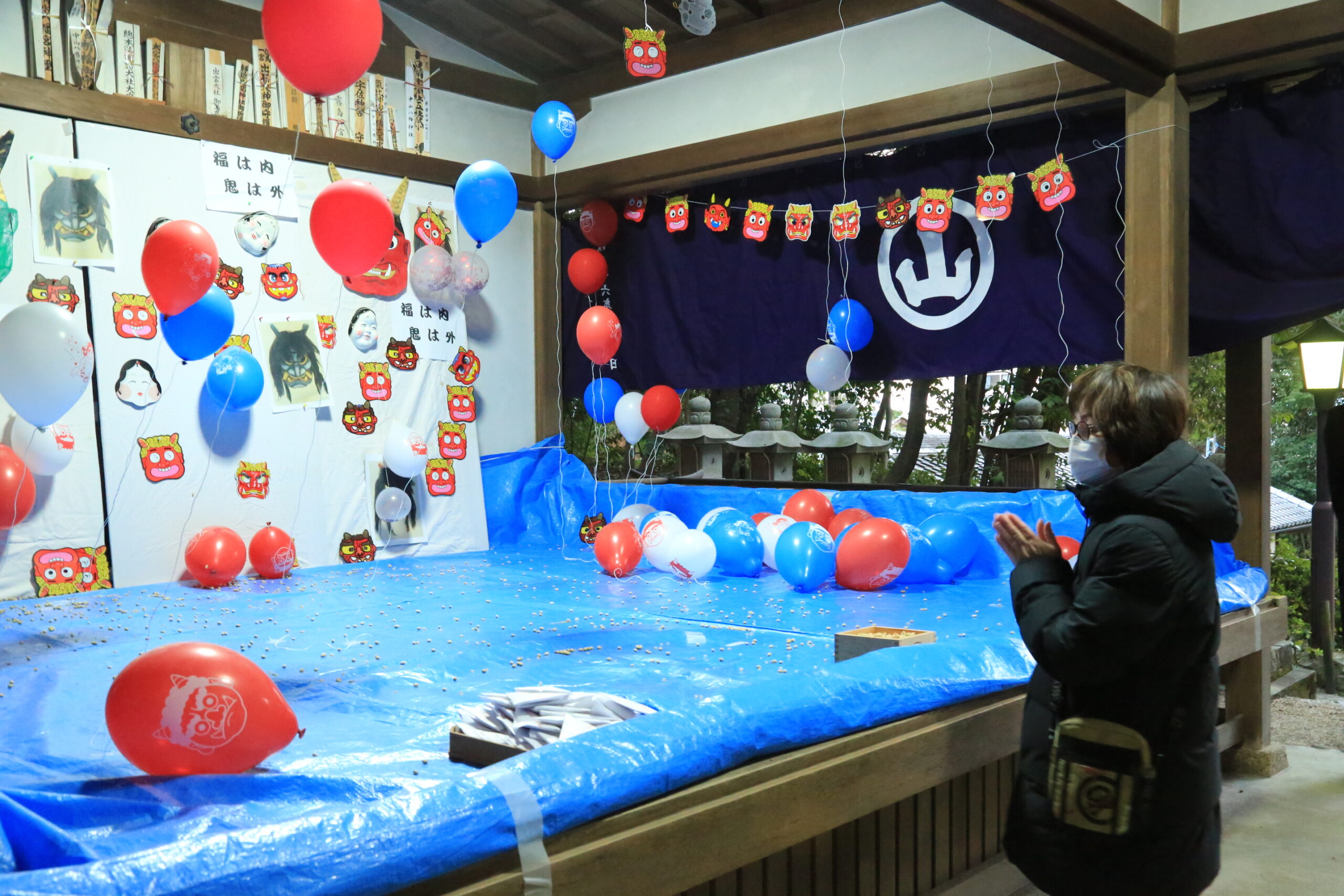 開運招福・厄除けを祈る行事です。拝殿壁には鬼の面等を貼り、参拝者には豆まきを楽しんで頂き(鬼はそとぉ~、福はうちぃ~)、神主による幸せを授ける鈴振りを行いました。